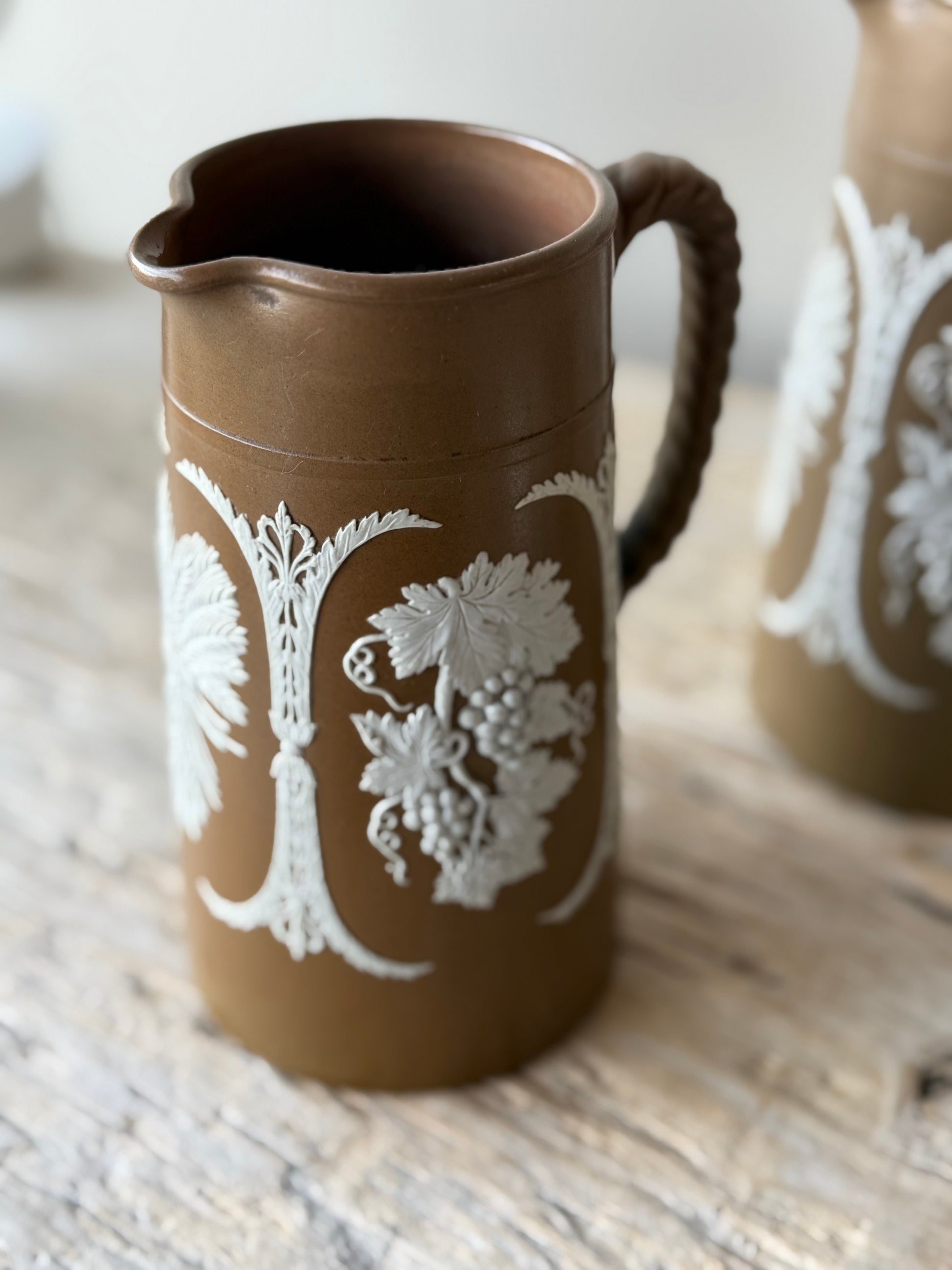 Stoneware brown base with white relief design , grapevines and foliage. Braided style handle on the 3 matching jugs .