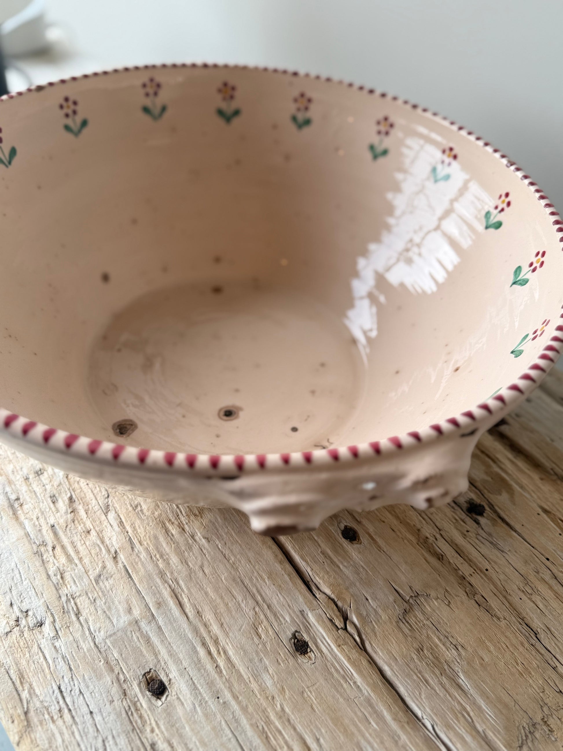 Vintage Italian porcelain bowl , pale cream with dark red ditsy floral motif . Worn writing on the side .